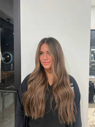 Peanut butter cup is all the rave this winter. Everyones favorite brunette with a perfect amount of rich highlights.
